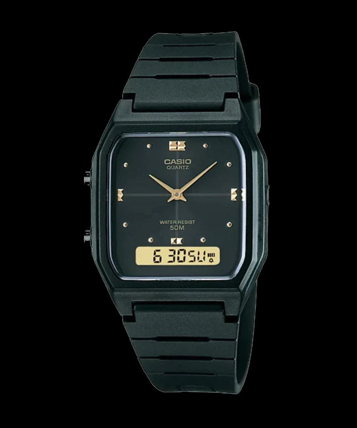 Features inclyde, Resin Band, Resin Glass, 50-meter WR, Dual time, 1/100-second stopwatch, Auto-calendar (28 days for February), 12/24-hour format