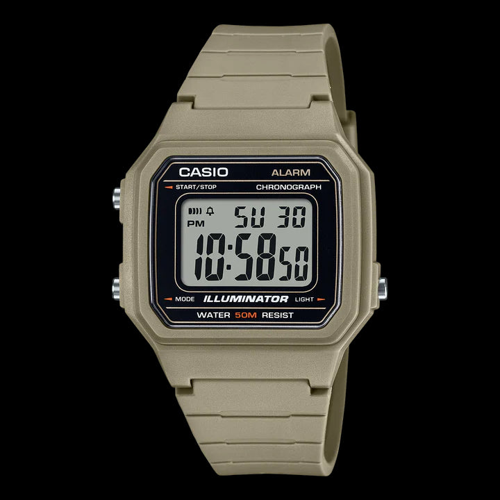 Make a statement that’s both bold and practical with a timepiece featuring a large display and utilitarian colors. Beige and green with accents in earthy hues and orange set a stylish outdoorsy tone for a dial that delivers high visibility and an easy read. Complete with water resistance up to 50 meters, a 7-year battery, LED backlight and other handy functions, these watches are always at the ready.