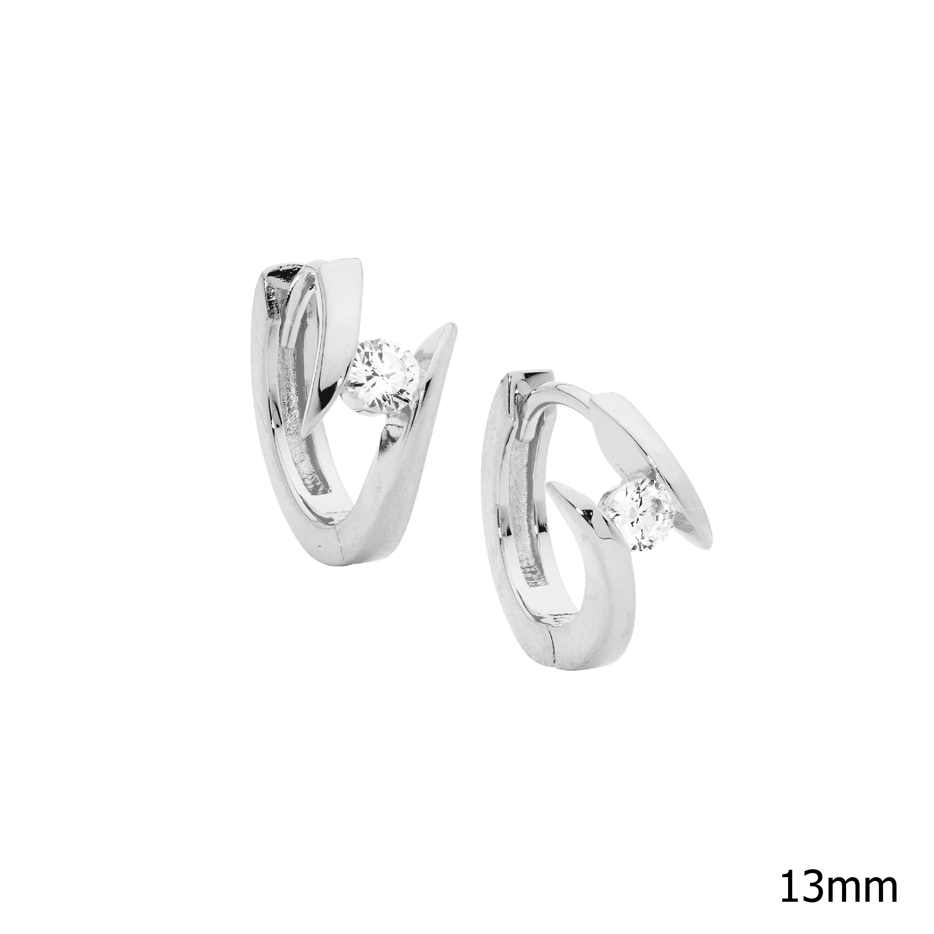 Sterling silver 13mm huggie earrings with cubic zirconia.