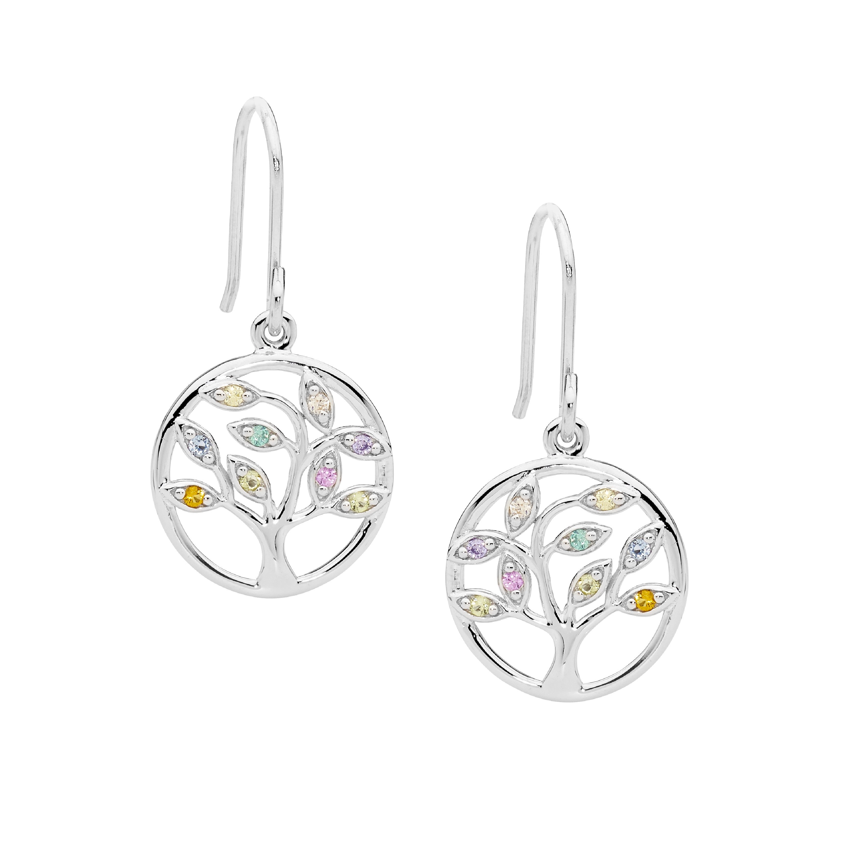 Sterling Silver Tree of Life Drop earring set with Multi Colour Cubic Zirconia on Shepherd Hooks.
