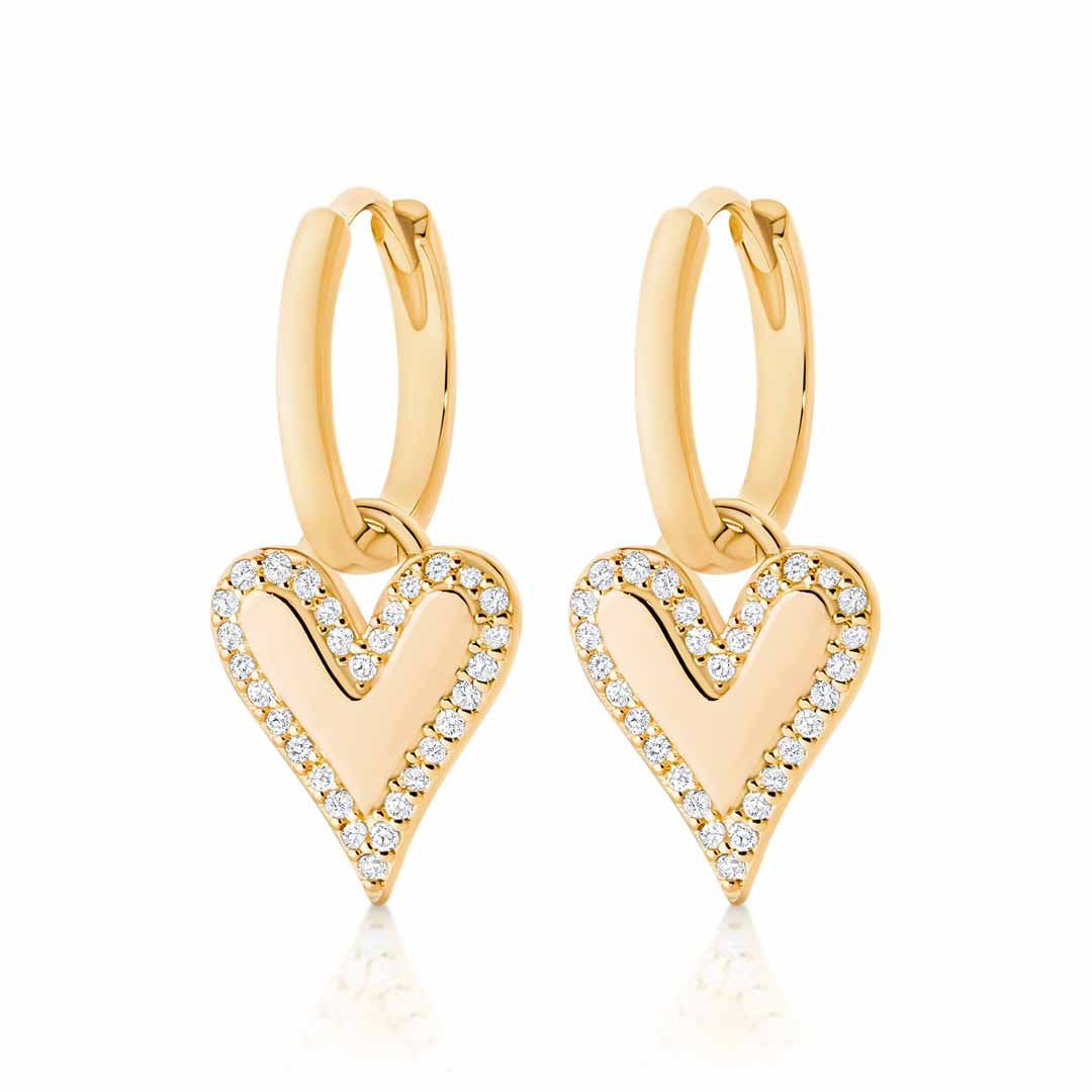 18ct Yellow Gold Plated Cubic Zirconia Edged Drop Hearts on Huggie
