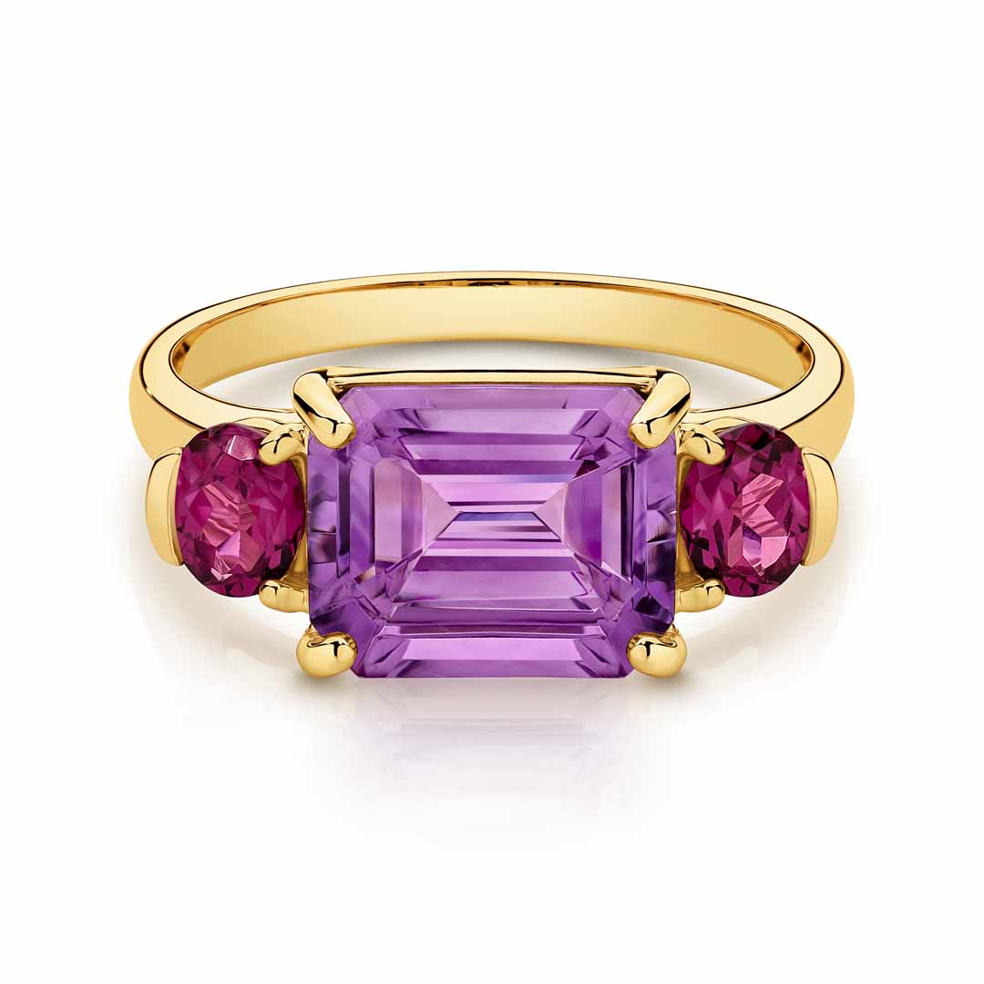 Rectangular cut Amethyst in 4 claw setting with 2 x oval Rhodolite on each side in a 9ct Yellow Gold setting