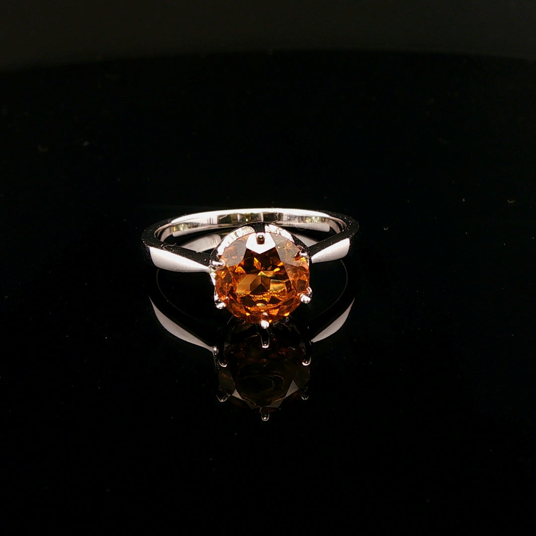 Exquisite solitaire ring made in Sterling Silver Rhodium Plated featuring a mesmerizing round brilliant Ginger Garnet, embraced by a striking 6 claw setting. The orange hue's of the stone exudes warmth and elegance. This ring is a timeless testament to understated luxury and refined craftsmanship.