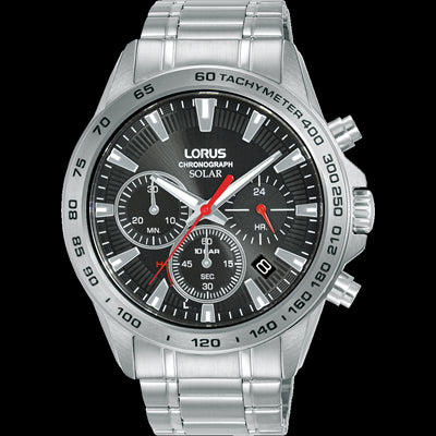 Mens solar lorus chronograph 100m water resistant with a Stopwatch that Measures 29 minutes, 59 seconds in 1 second increments with split/lap time, black dial and date.