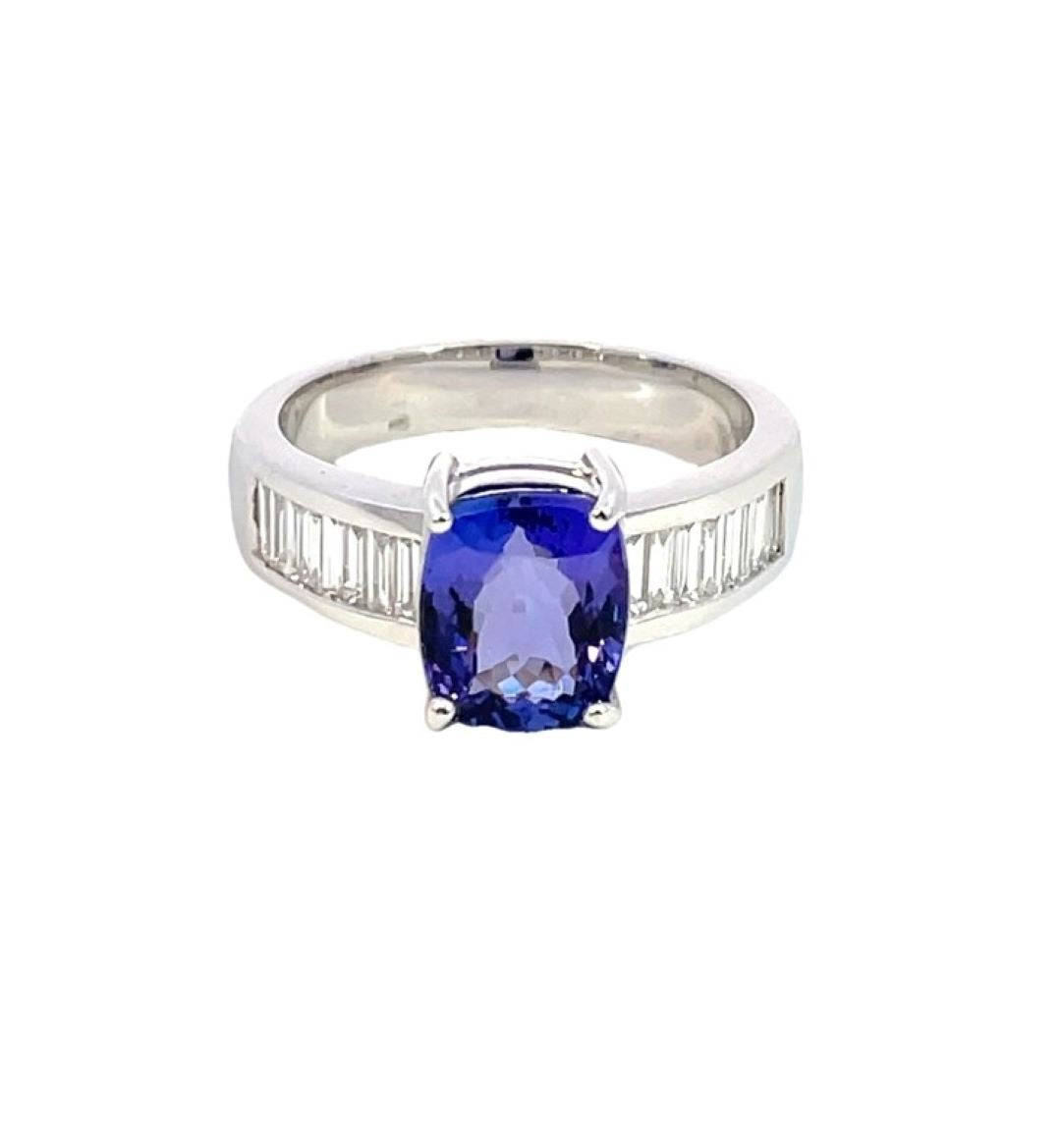 Discover the allure of sophistication with this stunning 2.71ct oval tanzanite, measuring 9.3x7.6mm, elegantly set in a four-claw setting on a wide 18ct white gold band. Flanked by channel-set baguette diamonds totaling 0.56ct, with GH color and SI clarity, this ring combines timeless elegance with modern brilliance. Perfect for making a statement of luxury and grace.