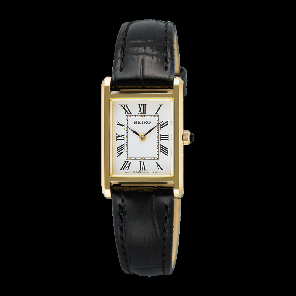 Seiko Conceptual Ladies "Tank" Gold Plated Case, Sapphire Crystal Glass with Black Leather Strap. Its Slim Rectangular profile exudes classic elegance.