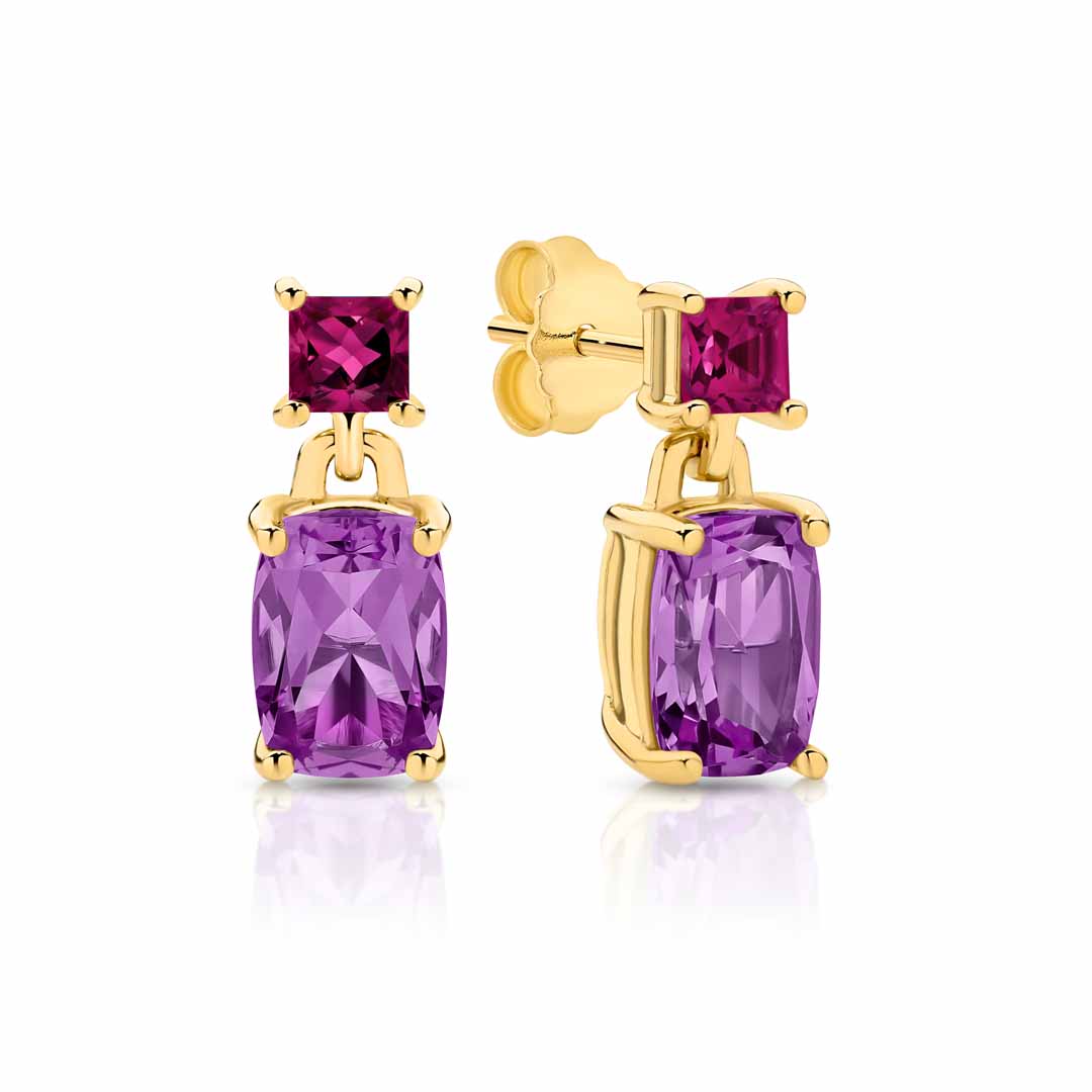 Oval Amethyst and Princess Cut Rhodolite drop studs in 9ct Yellow Gold