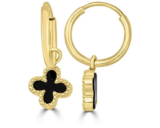 9ct Yellow Gold 4 Leaf Clover style drops set with Black Onyx on huggies