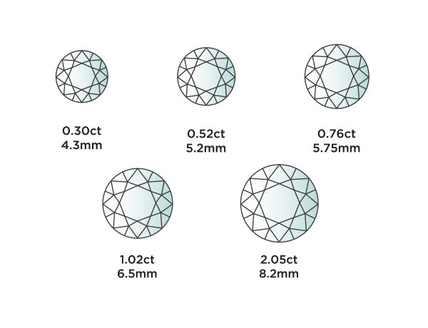 The method of measuring the carat of a diamond is by weight. One carat is 0.2 grams and can be further divided into 100 points which is used to determine the lower carat stones. For instance, a stone with 25 points is 0.25 carats. For a more visual indication of what this means, is the smaller the stone the lower in carat weight and the larger the stone, the higher the carat and price.