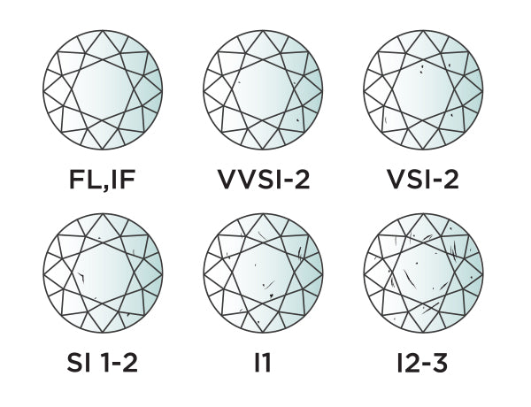 This relates to the marks of non-crystallised carbon called ‘inclusions’ found within the diamond. The inclusions vary in standards on the spectrum ranging from FL (flawless), SI1 () to I3. It is exceedingly rare for a diamond to be flawless, known as FL and is the highest level on the spectrum. SI1 is in the middle of the spectrum and it is recommended when buying a diamond, you should not purchase lower than this standard. I3 is the lowest as it includes the mot inclusions and is least clear.