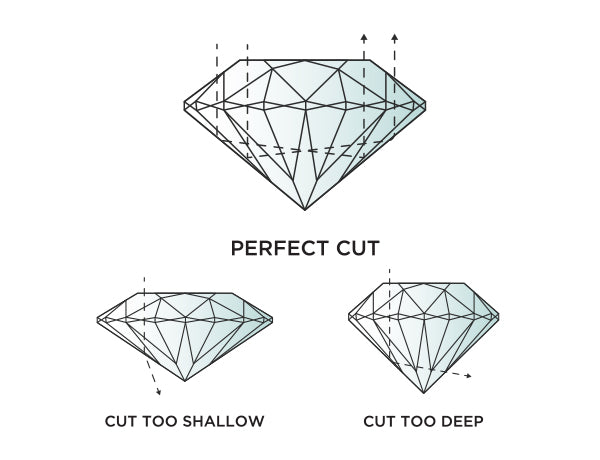 The cut of a stone is not relating to the shape, but refers to the way the cutter has formed it to best ensure that light bounces within the stone and back out through the top. If it has a defective cut (too long or too short) the light refracts on the inside and falls out down the bottom. This decreases the brightness and lustre of the stone. A well cut stone is neither exceedingly long nor shallow, it is luminous and will always dazzle even when dirty.The grading system varies from Ideal Cut to Good and lastly, Poor Cut. With round diamonds, it is suggested to never purchase below ‘Very Good’ and ‘Good’ in all other shapes. Again, the better cut stone the more it will cost.