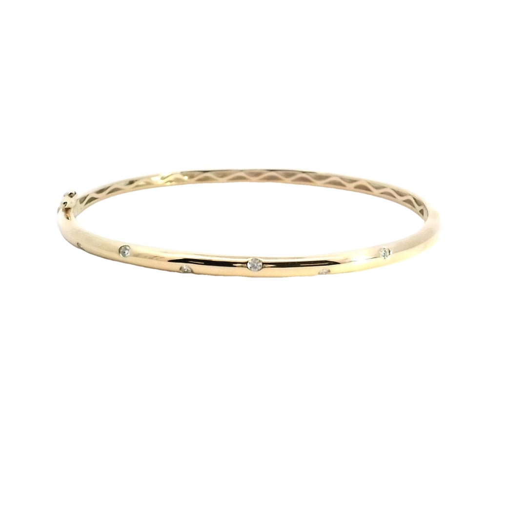 Elegant hinged 9ct Yellow Gold bangle Hammer set with Diamonds Total Diamond Weight = 0.20ct I/SI1