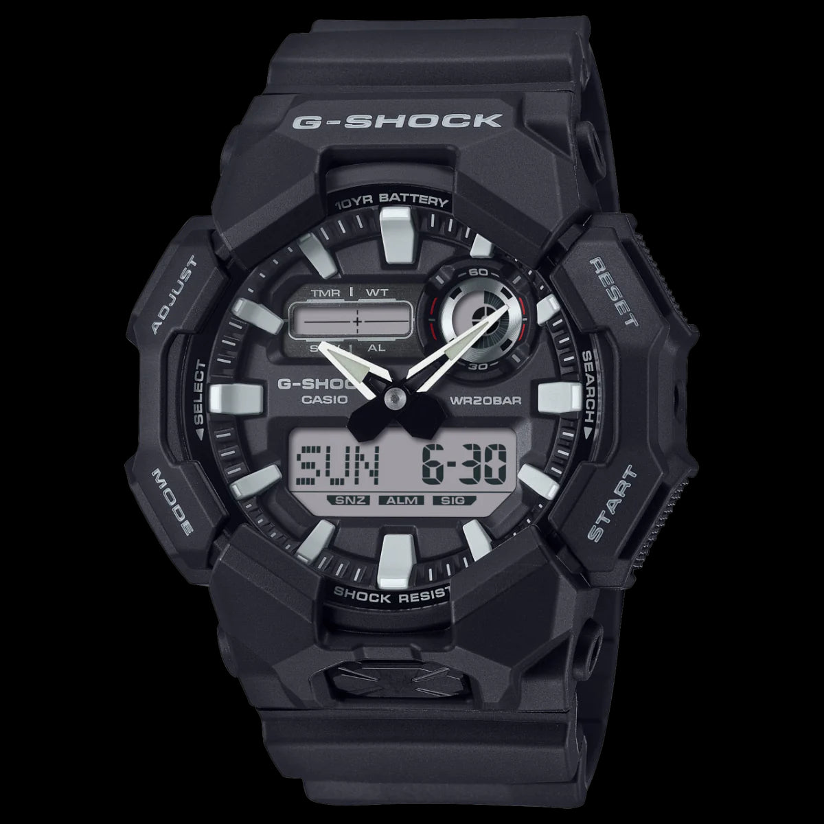 Enjoy a life of fewer battery changes with a large-case G-SHOCK with a 10-year battery you won’t have to worry about for ages. The analog-digital GA-010 delivers handy features like world time and stopwatch, as well as a high-brightness LED light, which can be easily accessed from the large button on front of the case, ensuring visibility even in the dark.