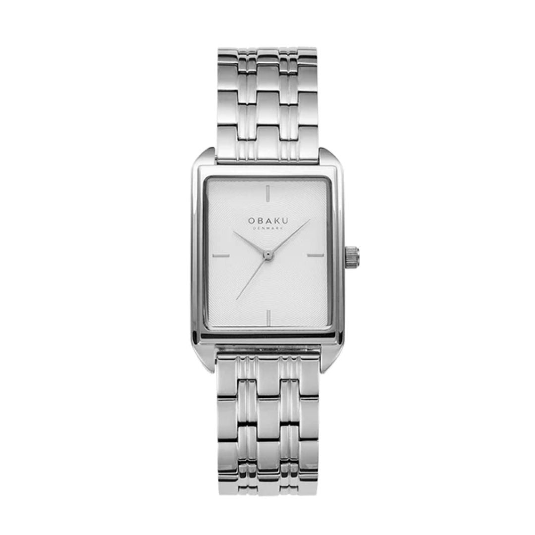 Stainless steel Obaku with a rectangle face, baton marks at 12,3,6 & 9 and a metal link bracelet.